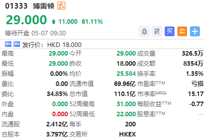 华盛资讯05月07日讯,港股博雷顿今日挂牌,截至发稿涨61.11%,报29.00港元/股,中签一手账面浮盈2200.0港元,最新总市值超110.10亿港元。该股此前公开发售获198.72倍认购,一手中签率2.0%。