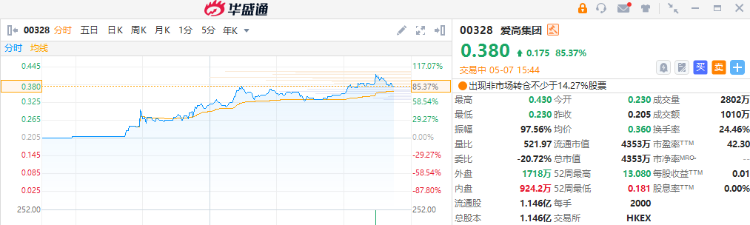 爱高集团(00328)尾盘涨幅进一步扩大,股价一度涨超100%,截至发稿,涨85.37%,报0.38港元,成交额1010万港元。