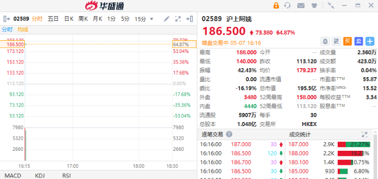 华盛资讯05月07日讯,港股沪上阿姨正在暗盘交易中,截至发稿涨64.87%,报186.5港元/股,中签一手账面浮盈超2200港元,最新总市值超195亿港元。该股预计将于5月8日正式挂牌上市,配售结果将于今日晚间披露。