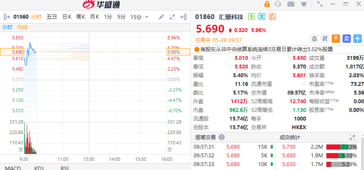 5月8日,汇量科技(01860)高开近5%,截至发稿,涨5.96%,报5.69港元,成交额1.817亿港元。