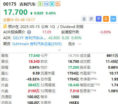 吉利汽车(00175)涨超5%,截至发稿,涨5.48%,报17.7港元,成交额11.43亿港元。