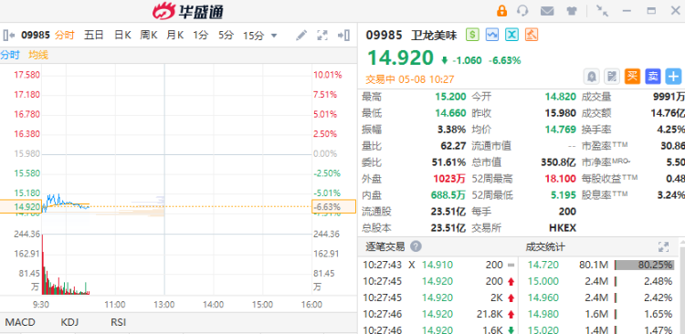 而卫龙美味的走势则弱于老铺黄金。截至发稿,跌6.63%。