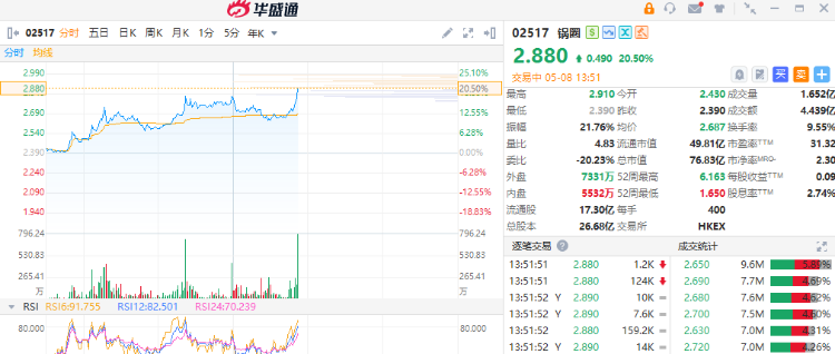 锅圈(02517)午后持续走高,股价上涨20.5%,现报2.88港元,成交额4.4亿港元。