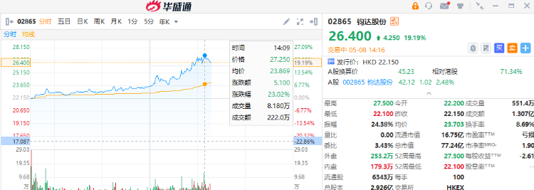 钧达股份(02865)今日上市,午后涨幅扩大逾20%,截至发稿,涨19.19%,报26.4港元,成交额1.3亿港元。该股此前公开发售获3.5倍认购,一手中签率23.84%。
