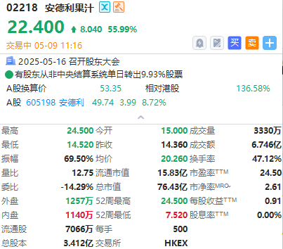 近日港股饮料股频频受到市场关注,沪上阿姨(02589.HK)上市首日涨超40%。不过表现更为炸裂的是,安德利果汁(02218.HK)自5月6日开涨以来,从5月2日收盘的10.54港元升至当前22.70港元,已实现翻倍上涨。