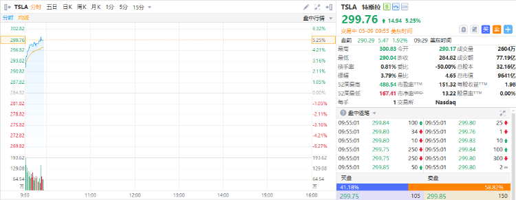 特斯拉涨幅扩大至5%,股价创3月3日以来新高