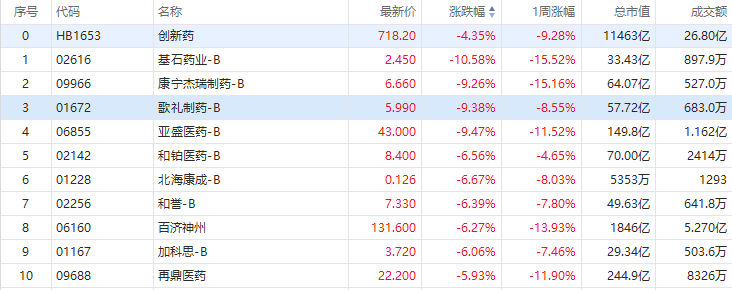 医药股全线重挫,截至发稿,基石药业-B跌超10%,歌礼制药-B、康宁杰瑞制药-B、亚盛医药-B均跌超9%,百济神州跌超6%,石药集团跌超5%。