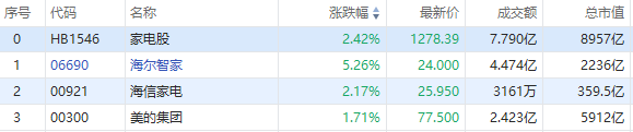 港股家电股今日普涨,截至发稿,海尔智家涨5%,海信家电涨超2%,美的集团涨近2%。