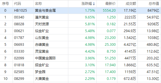黄金股午后整体拉升,潼关黄金涨9.65%,山东黄金、赤峰黄金涨近5%,灵宝黄金涨超4%,中国黄金国际、招金矿业涨超3%。