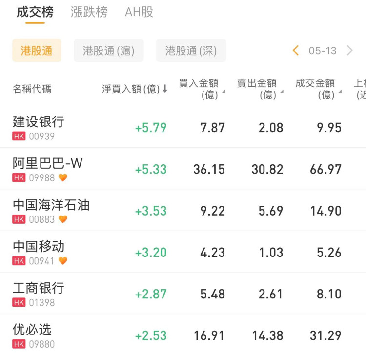建设银行、阿里巴巴-W、中国海洋石油分别获净买入5.79亿港元、5.33亿港元、3.53亿港元;