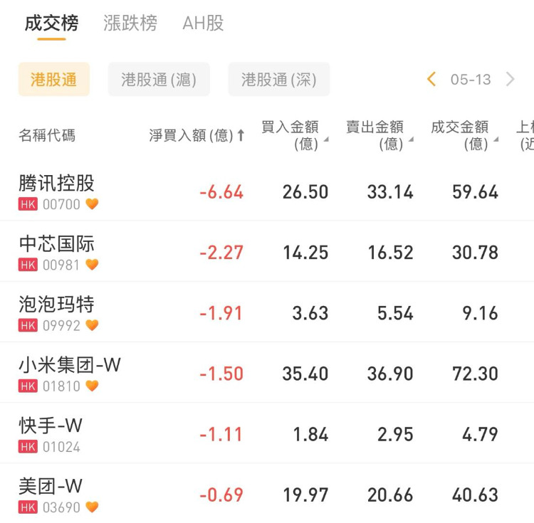 腾讯控股、中芯国际、泡泡玛特分别遭净卖出6.64亿港元、2.27亿港元、1.91亿港元。