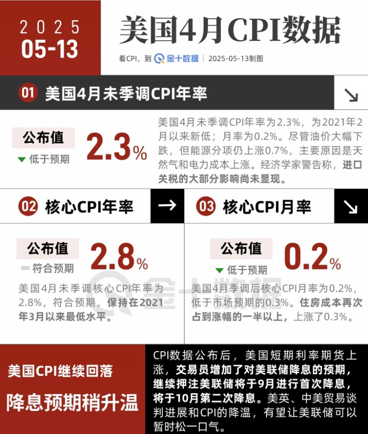 分析师卡梅伦·克赖斯表示,CPI数据低于预期表明关税对更广泛价格的直接传导应较为有限。4月商品价格与上月持平,剔除食品和能源后仅上涨0.1%。这或许意味着,即便当前关税幅度不大,其(对通胀的)全面影响也尚未充分显现,因为零售商无疑仍在消化此前囤积的库存,这导致贸易逆差持续扩大。尽管贸易战政策的宏观影响仍未明晰,但低于预期的通胀数据对金融资产的短期提振作用毋庸置疑。
