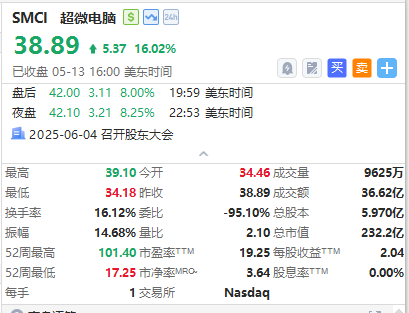 华盛资讯5月14日讯,美股夜盘时段,截至发稿,超微电脑大涨8%,传特朗普政府拟放松AI芯片出口限制。