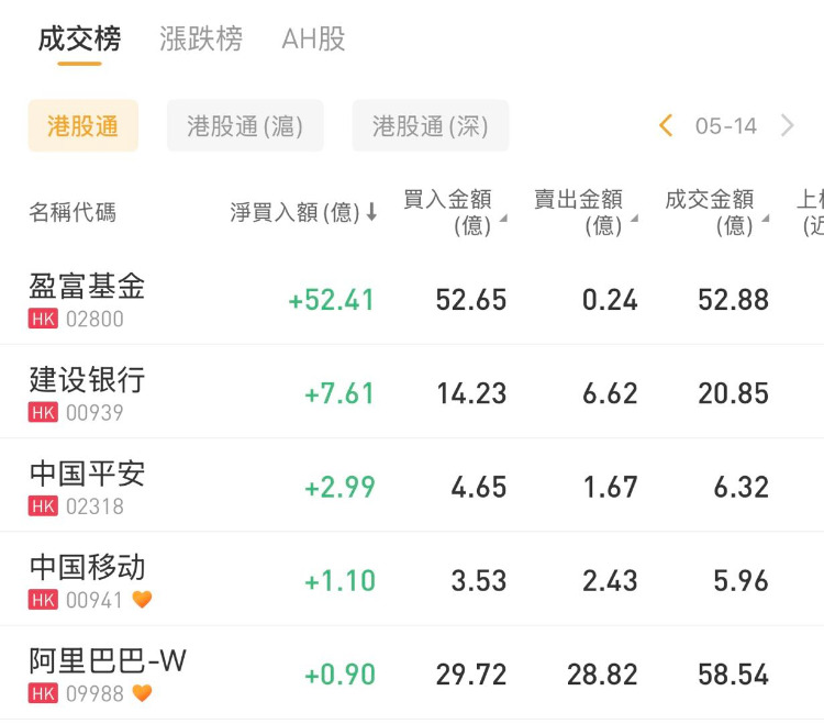 盈富基金、建设银行、中国平安分别获净买入52.41亿港元、7.61亿港元、2.99亿港元;