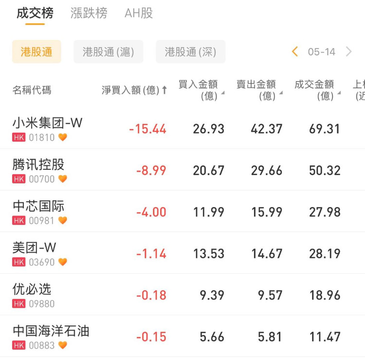 小米集团-W、腾讯控股、中芯国际分别遭净卖出15.44亿港元、8.99亿港元、4亿港元。