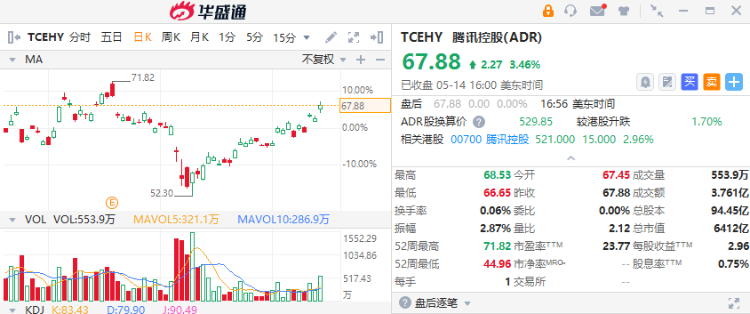 腾讯控股ADR隔夜涨3.5%,第一季度股东应占盈利478.21亿元 同比增加14%