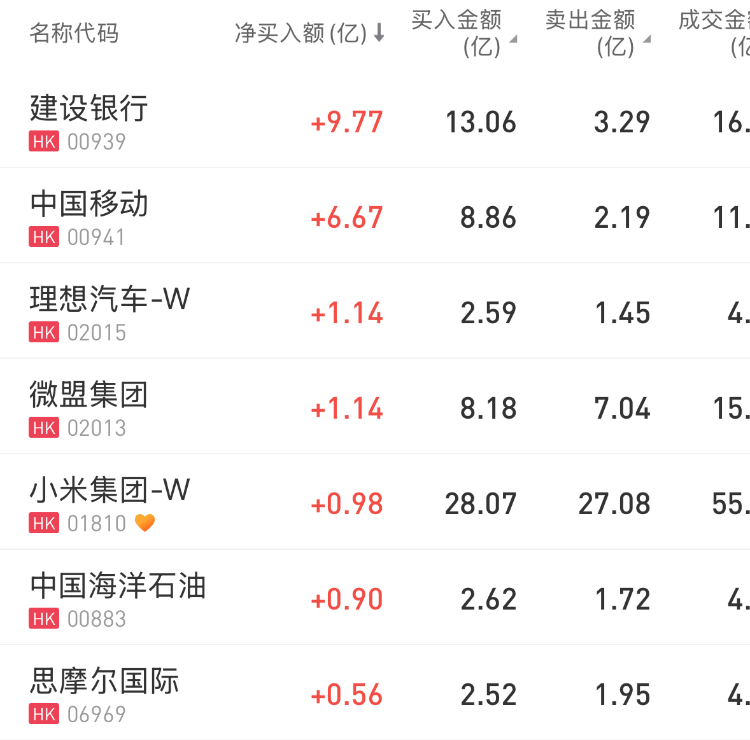 建设银行 、中国移动、理想汽车-W 分别获净买入9.77亿港元、6.67亿港元、1.14亿港元;