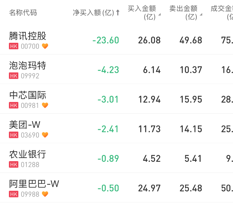 腾讯控股、泡泡玛特、中芯国际分别遭净卖出23.6亿港元、4.23亿港元、3.01亿港元。