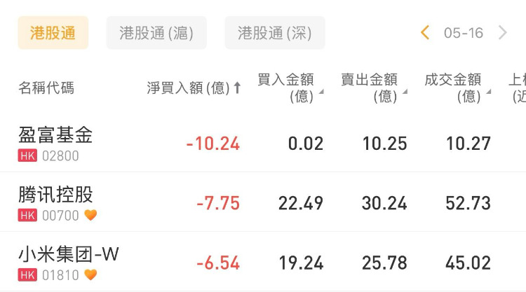 盈富基金、腾讯控股、小米集团-W分别遭净卖出10.24亿港元、7.75亿港元、6.54亿港元。
