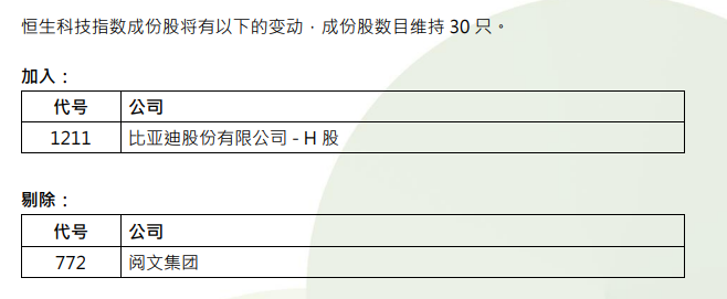 恒生指数调入美的集团、中通快递,恒生科技指数调入比亚迪股份、剔除阅文集团,恒生中国企业指数成份股没有变动。