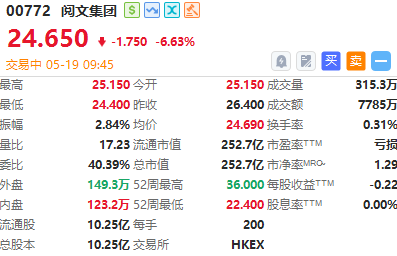 阅文集团(00772)低开低走,现跌超6%报24.65港元,成交额7785万港元。
