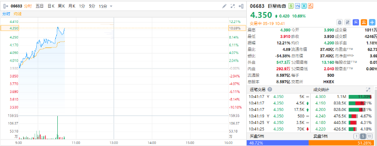 巨星传奇 $06683.HK 再涨超10%,截至发稿,涨10.69%,报4.35港元,成交额4246万港元。