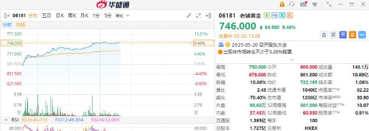 老铺黄金(06181)涨超9%,截至发稿,涨9.46%,报746港元,成交额10.69亿港元。