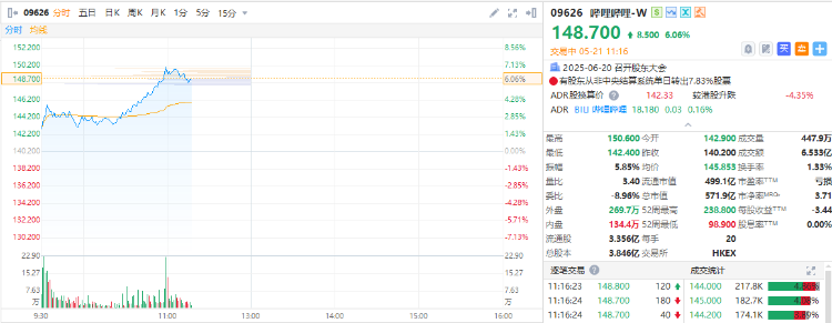 哔哩哔哩-W $09626.HK 绩后涨超6%,截至发稿,涨6.06%,报148.7港元,成交额6.535亿港元。
