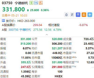 宁德时代(03750)上市次日涨超8%,该股昨日大涨超16%较A股溢价。截至发稿,涨8.36%,报331.8港元,成交额23.4亿港元。