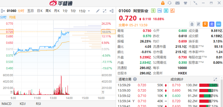 5月21日,阿里影业(01060)午后涨近20%,两日累计涨幅已超50%,截至发稿,涨18.03%,报0.72港元,成交额6.159亿港元。