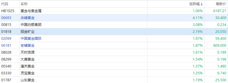 港股市场黄金概念股逆势上涨,其中,赤峰黄金涨超4%,招金矿业涨超2%,山东黄金、老铺黄金、潼关黄金、中国黄金国际涨超1%。消息面上,金价重新走强,伦敦金现今日盘中一度冲高至3340美元/盎司,为连续第四日上涨,创5月9日以来新高。