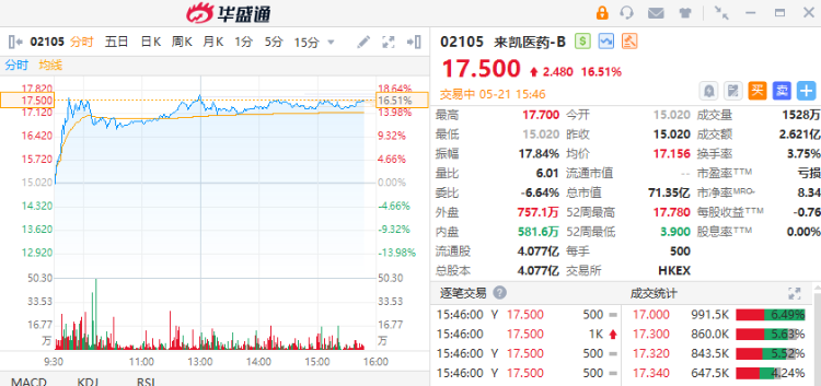 5月21日,来凯医药-B(02105)再度走强,截至发稿,涨16.51%,报17.5港元,成交额2.621亿港元。
