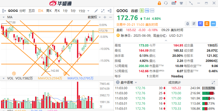 5月21日讯,谷歌高开高走,涨幅现扩大至4.5%,现报价172.76美元。