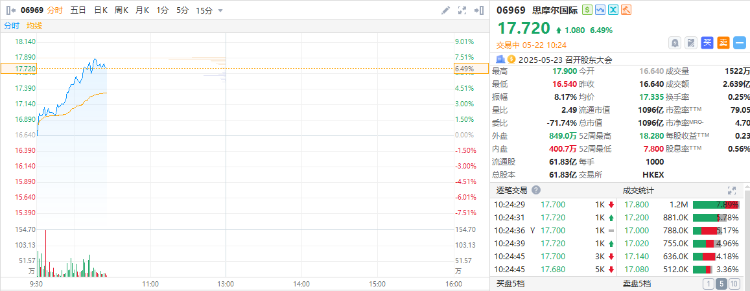 思摩尔国际 $06969.HK 涨超6%,截至发稿,涨6.49%,报17.72港元,成交额2.639亿港元。