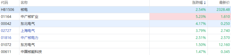 港股核电板块集体上涨,截至发稿,中广核矿业涨超5%,东北电气涨超4%,上海电气涨超3%,中广核电力涨超2%。