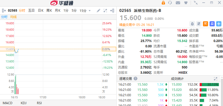 港股派格生物医药-B正在暗盘交易中,截至发稿平盘,报15.60港元/股,最新总市值超60亿港元。该股预计将于5月27日正式挂牌上市,配售结果将于今日晚间披露。