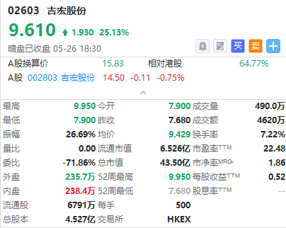 华盛资讯05月26日讯,港股吉宏股份暗盘收涨25.13%,报9.61港元/股,中签一手账面浮盈965.0港元,最新总市值超43.50亿港元。