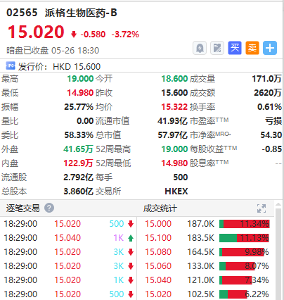 港股派格生物医药-B暗盘收跌3.72%,报15.02港元/股,中签一手账面浮亏290.0港元,最新总市值超57.97亿港元。