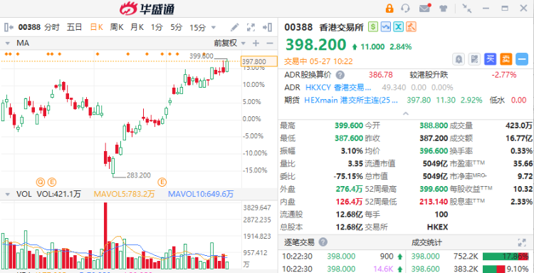 5月27日讯,港交所(00388)早盘涨近3%,创近三年新高。截至发稿,涨2.79%,报398港元,成交额15.67亿港元。