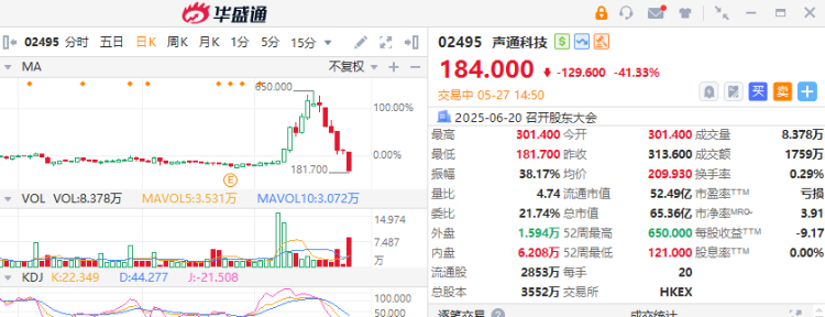5月27日,港股市场再度上演惊心动魄的一幕,交互式人工智能龙头企业声通科技(02495.HK)盘中股价大跌超40%,最低触及180港元/股。