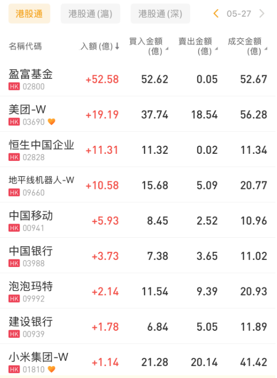 盈富基金、美团-W、地平线机器人-W分别获净买入52.58亿港元、19.19亿港元、10.58亿港元;