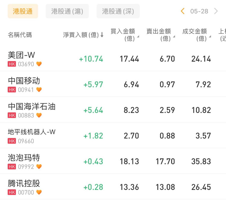 美团-W、中国移动、中国海洋石油分别获净买入10.74亿港元、5.97亿港元、5.64亿港元;