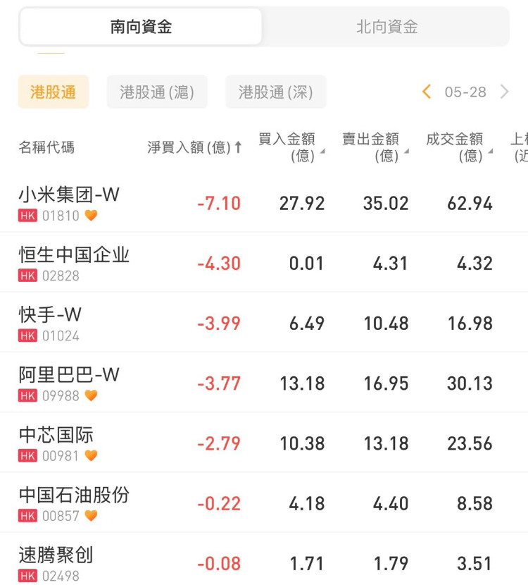 小米集团-W、快手-W、阿里巴巴-W分别遭净卖出7.10亿港元、3.99亿港元、3.77亿港元。