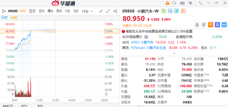 5月29日,小鹏汽车-W(09868)早盘走强,截至发稿,涨5.89%,报80.95港元,成交额10.76亿港元。