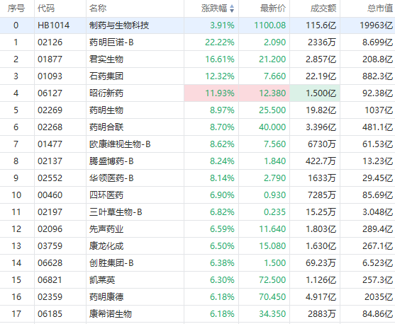 截至发稿,药明巨诺-B飙涨22%,君实生物大涨16%,石药集团涨超12%,药明生物、药明合联、腾盛博药-B涨超8%,药明康德涨超6%。