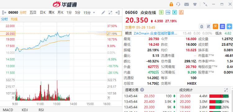 众安在线彻底爆发。今天上午,该股一度上涨达25%,近五个交易日持续拉升,涨幅达66%。午后该股持续上涨,截至发稿,现涨超27%。