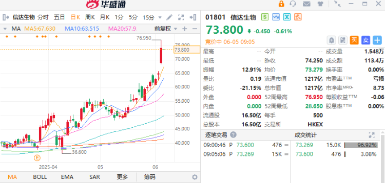 还有中国抗体-B早盘时段一度冲高接近50%,最后收涨42.5%并实现股价4日翻倍领涨板块;华领医药-B大幅收涨14.77%,再鼎医药、泰格医药等百亿巨头的股价盘中涨幅均超过10%。
