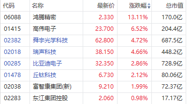 6月5日,港股手机产业链午后涨幅扩大,截至发稿,鸿腾精密涨超13%,高伟电子涨超6%,舜宇光学科技、瑞声科技涨近5%。