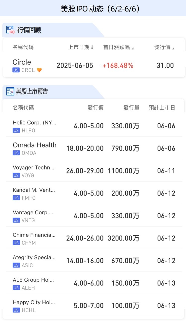 美股方面,“稳定币第一股”Circle $CRCL 周内登陆美股,首日涨幅超168%!火爆表现为美股IPO市场注入强心剂。