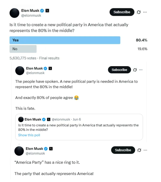 在与美国总统特朗普公开发生“口水战”后,美国亿万富翁、前政府效率部牵头人马斯克曾于当地时间5日在社交平台X上发起一项投票,询问“现在是否是时候在美国创建一个真正代表80%中间派的新政党?